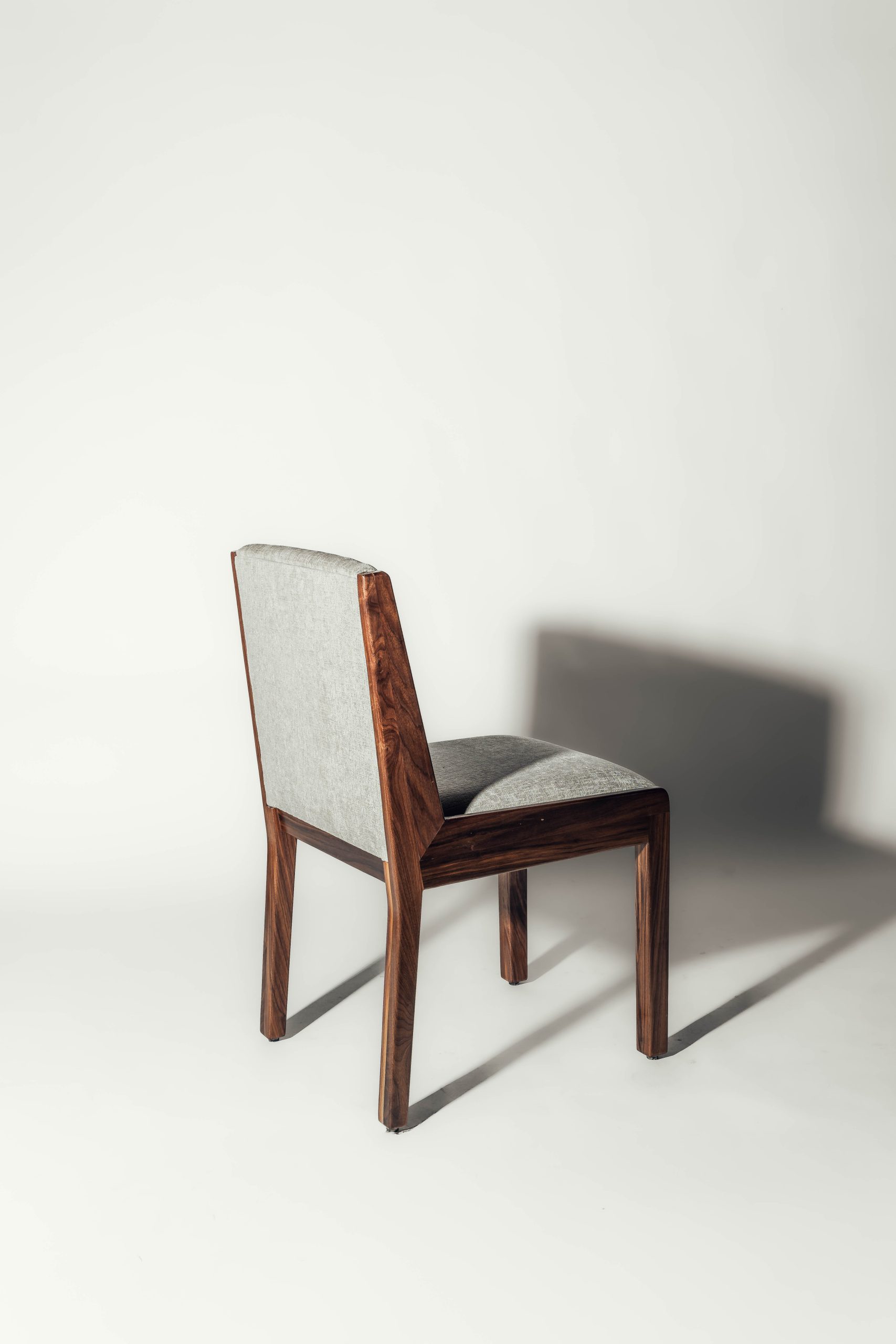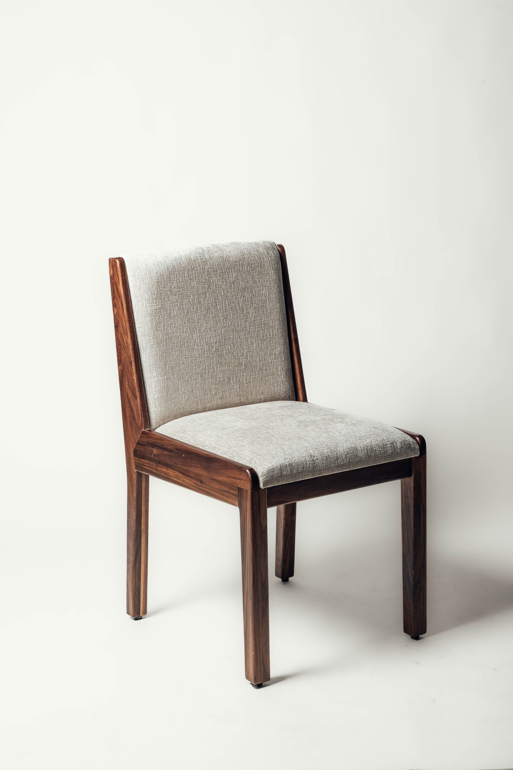Silla moderna, con diseño especial, laterales en la misma madera en respaldo y asiento, ensamble en escoplo, tapicería con costura oculta en dos partes. Telas y colores a seleccionar